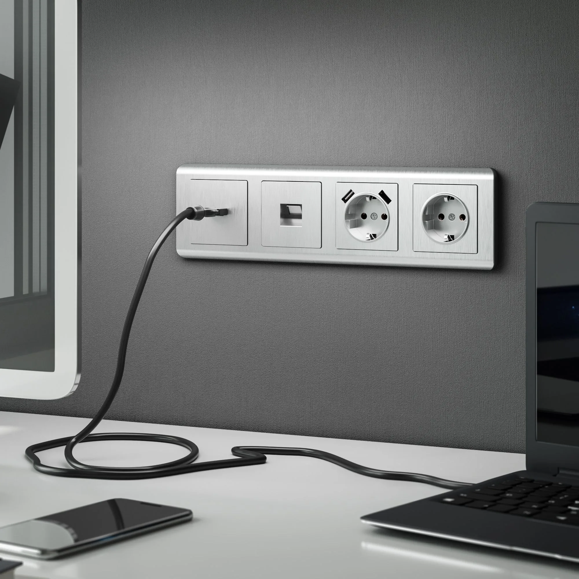 Лицевая панель выполнена в серебряном цвете с рельефной фактурой и тактильной мягкостью. Такая поверхность не бликует, не притягивает пыль и идеально вписывается в любые стили — от скандинавского минимализма до лофта и классики. Гармонично сочетается с любыми отделочными материалами, а универсальная совместимость со всеми рамками Werkel позволяет создавать индивидуальные композиции под ваш вкус.