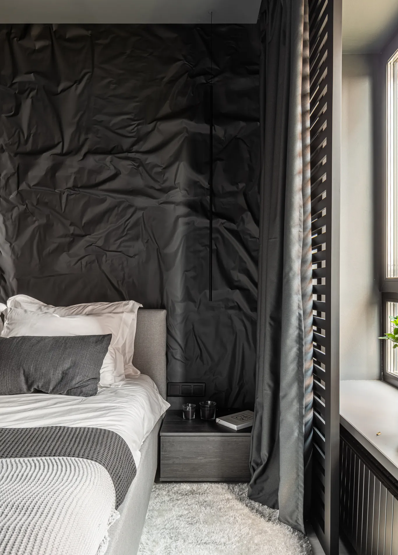 • Главной "фишкой" стала эффектная мятая стена за изголовьем кровати, которая стала центральным элементом комнаты .